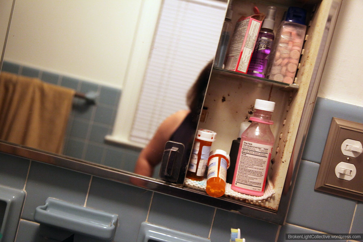 I like the angle, the partial image in the mirror, the visible contents of the cabinet – it’s such an arty unarty photograph – well done you!