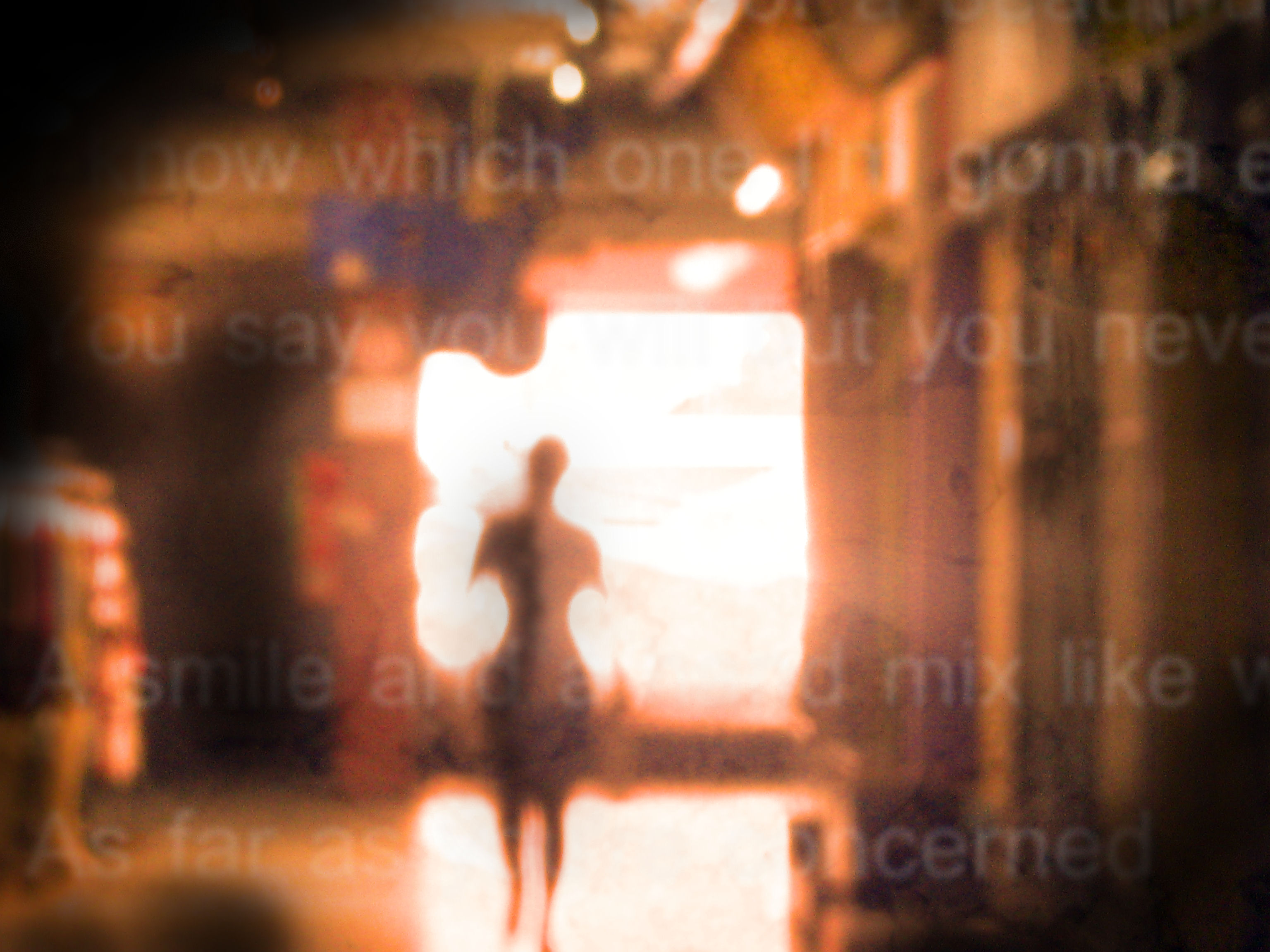 About this photo: An experiment with layers and textures. Taken inside Siam Square in Bangkok shortly before it was gutted by fire following the Red Shirt riots. I like the way the out of focus figure was surrounded by light.
