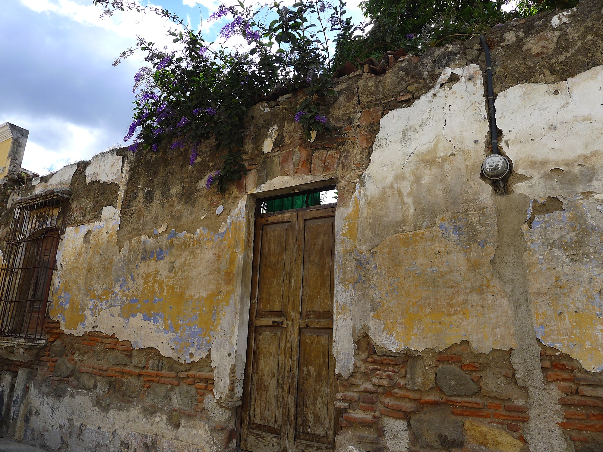 About this photo: I have always had a fascination with dilapidated buildings. I found many amazing buildings in various states of disrepair during my recent trip to Guatemala. I was staying in Xela and studying Spanish for a week. I find these kinds of trips to be the challenge that I need. Difficult, exhilarating and soul-searching. After my classes, I enjoyed wandering the old streets of Xela and snapping pictures of the old, colorful buildings. I adored the crazy bursts of bouganvillas and other flowering plants coming out of the old rooftops of the buildings. I also loved the history of each building for if you looked closely, you could see the layers of paint colors and imagine what the building used to be like throughout time. After all the years and everything these buildings have been through and seen, they were still standing beautifully and proud.