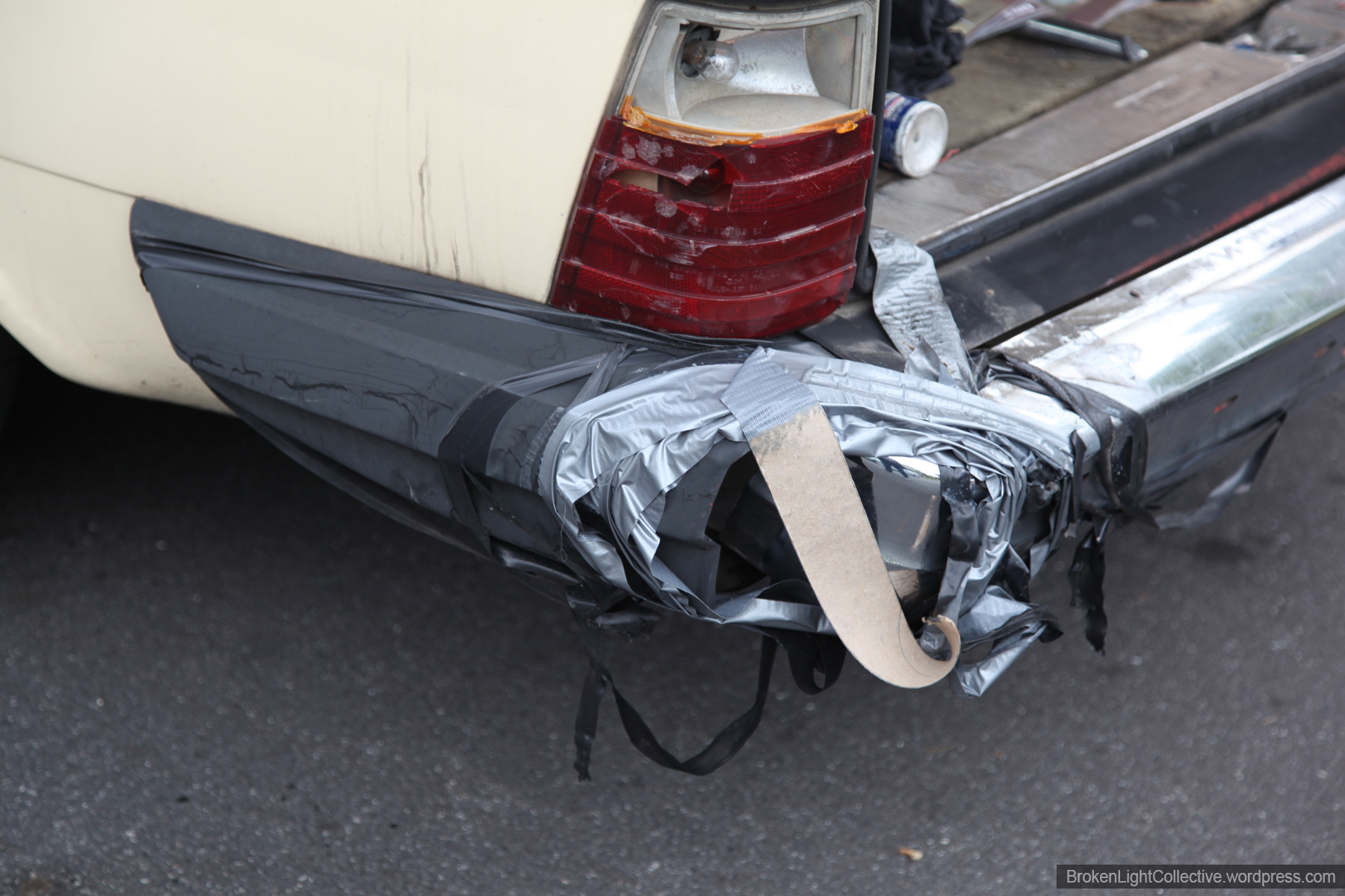 About this photo: This car was sitting on the street outside my house. It looked okay from the front, but from the back it looked like it was falling apart. Sometimes I feel like that. Like I am somehow managing to function, but falling apart inside and held together by mere tape.