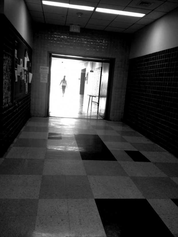 About this photo: These walls only remind me of the feelings of negativity, anxiousness, loneliness, and despair. The blue tiles lined with a hopeless effort to fit in. The floor always reflecting a self conscious, fearful, younger me, who thought she had everything under control. Luckily, I am in a good enough place today, where I can be here, in these mixed up hallways and not be pulled back to the thoughts and behaviors that ruled my every move in this school.