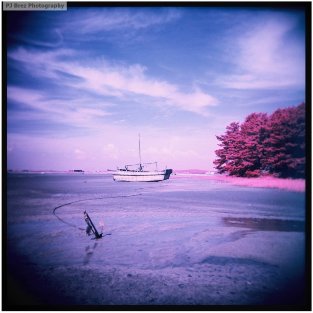 About this photo: “This photograph was shot with the super rare Kodak Aerochrome color infrared film. I found this old boat washed up in a baked dry tide pool, no water in sight. I found the whole image somewhat sad and definitely ironic since the boat was still anchored down despite there being no chance of it floating away. It reminded me of how stubborn and set in my ways and cyclical patterns I can, at times, be.