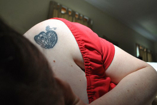 About this photo: “Here I am in my creative den. I suffer from chronic migraines and I spend a lot of time in my room in the dark. Today as things were feeling better I opened the curtains a little and took this self-portrait. You can see the zentangle that I designed for my tattoo. I call her sunshine in a nod to John Denver. ‘Sunshine on my shoulder makes me happy.’ I really identify with butterflies and I try to think of my time of rest as my transformation into a butterfly. Some of my best creative ideas come to me while I heal. I believe I am becoming someone better.“