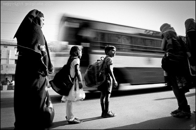 About this photo: “I took this photo while working on a project in India. I was waiting at a bus stop and liked the idea of this photo. It was a struggle to keep the shutter slow enough to blur the bus in bright sunlight and at the same time not massively over expose and also hope the subjects didn’t move so they stayed relatively sharp. Worked better in black and white as the colours of the bus distracted too much from the people in the picture.”