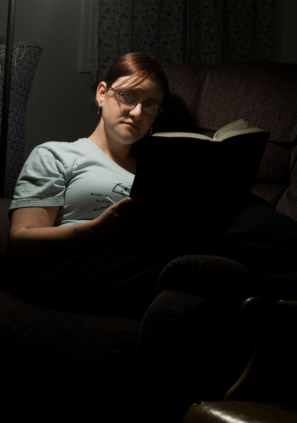 About this photo: “This is a self-portrait that is part of a series of 52 self-portraits I’ve made a goal to take this year. It represents how I feel when I read. My favorite genres are science fiction and fantasy, because when I read something in those genres I feel completely transported – I often read just before bed, because it helps me to wind down and calm my mind, so that it’s not running in circles or creating new worries to feed my anxiety. The darkness surrounding me in the photo represents both the outside world from which I seek refuge, and the way that the outside world is muted when I read. The light represents the clarity and calm that reading brings to me.“